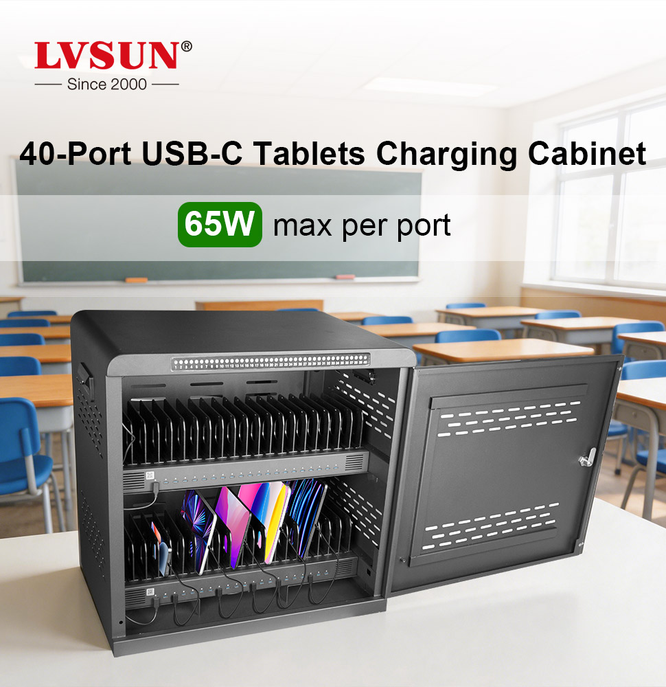 The USB-C 40 Charging Cabinet is a high-capacity charging cabinet engineered for environments—like schools, labs, testing centers, or shared device programs—where up to 40 tablets need to be stored, charged, and secured in a space-efficient, organized way. It combines clean cable management, strong security, and durability in a vertical footprint that saves on floor space.The 40 USB-C Charging Cabinet is designed for high-performance devices requiring up to 65W max per port for fast and reliable charging.