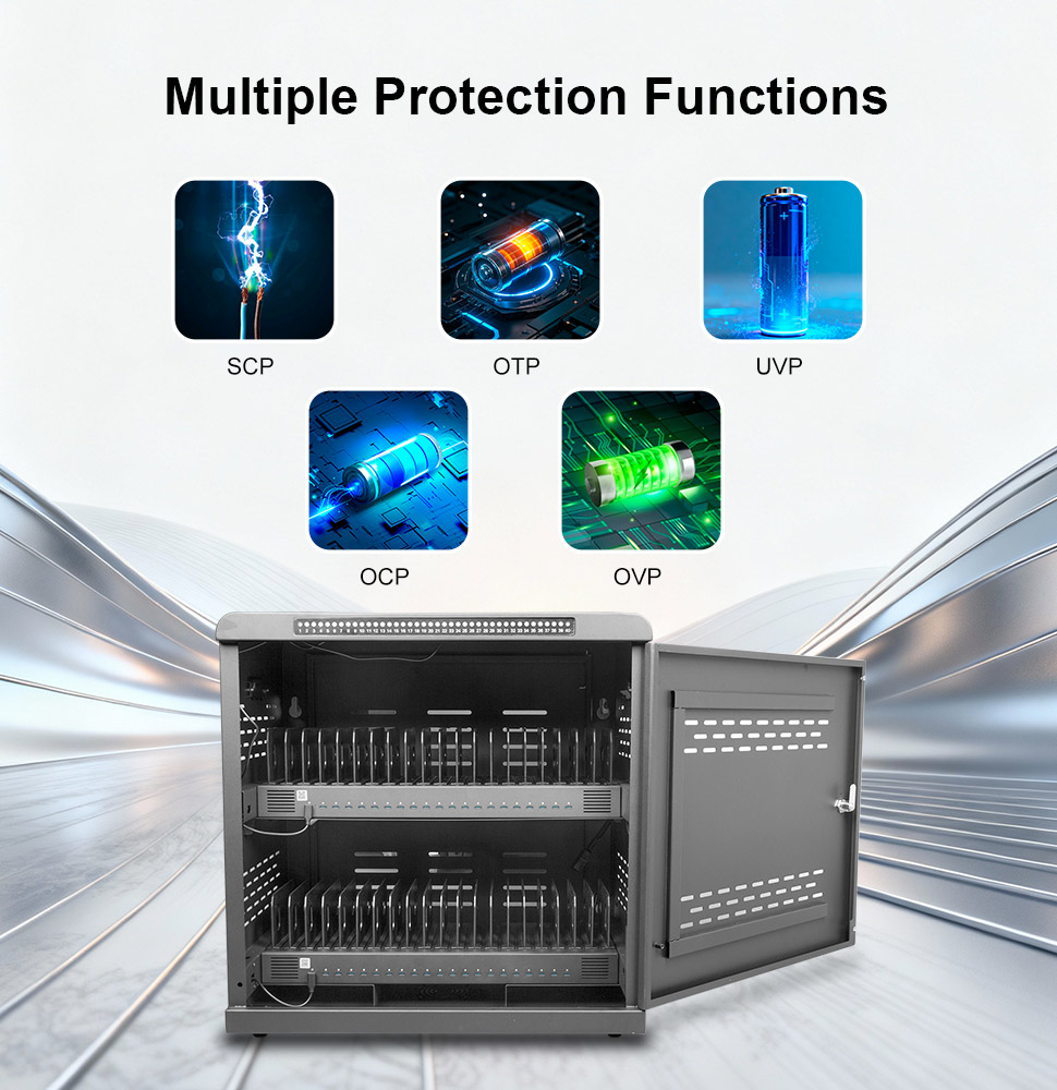 3. Enhanced Device Management & Security: External status lights provide at-a-glance visibility to monitor charging progress and identify ready-to-use devices effortlessly. Combined with secure locking mechanisms, this system ensures devices remain protected during off-hours, overnight storage, or when unattended, reducing the risk of theft or unauthorized access.
