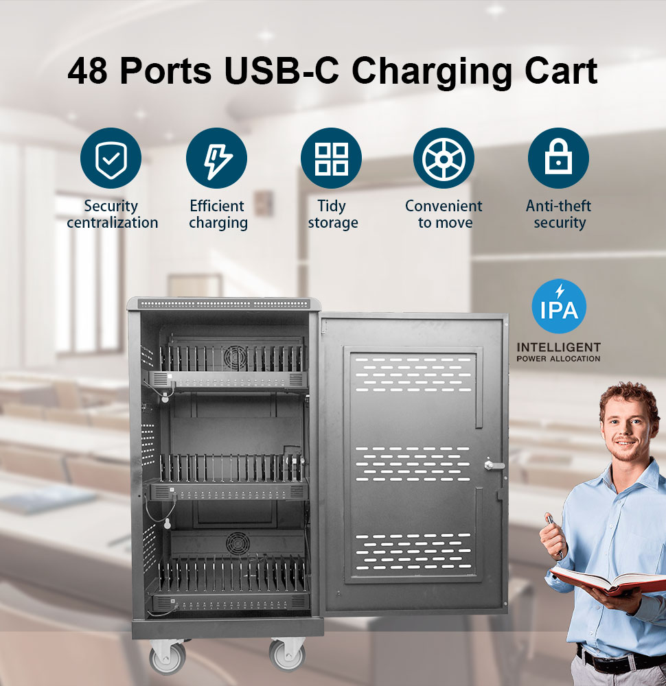 4. Carga IPA y gestión térmica: La estación de carga USB-C utiliza el modo de carga inteligente IPA para hacer que el gabinete de carga sea más estable, confiable y duradero; al mismo tiempo, integra sensores térmicos y control de ventilador para mantener una temperatura adecuada dentro del gabinete y mejorar la estabilidad de carga.