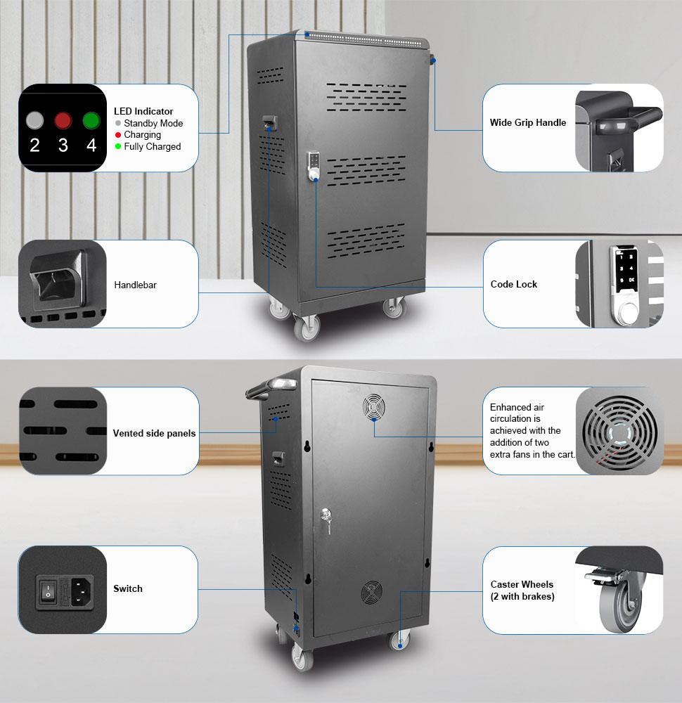 Sistema Inteligente de Carga y Alimentación: Incluye un módulo de carga inteligente integrado con múltiples puertos USB-C o ranuras dedicadas que permiten la carga rápida sincronizada sin dañar los dispositivos; un circuito de diseño profesional con cables ocultos para evitar la exposición, el desgaste y los tirones; y robustas funciones de seguridad, como protección contra sobrecargas, cortocircuitos y sobrecalentamiento, que cumplen con las normas de seguridad y están equipadas con un disyuntor para garantizar un proceso de carga a prueba de fallos. Esto se combina con una construcción robusta y un diseño centrado en el usuario, con una estructura de acero resistente, compartimentos organizados en capas que admiten dispositivos de diferentes tamaños y evitan arañazos, y una refrigeración y accesibilidad optimizadas para un funcionamiento fiable y fácil de usar.