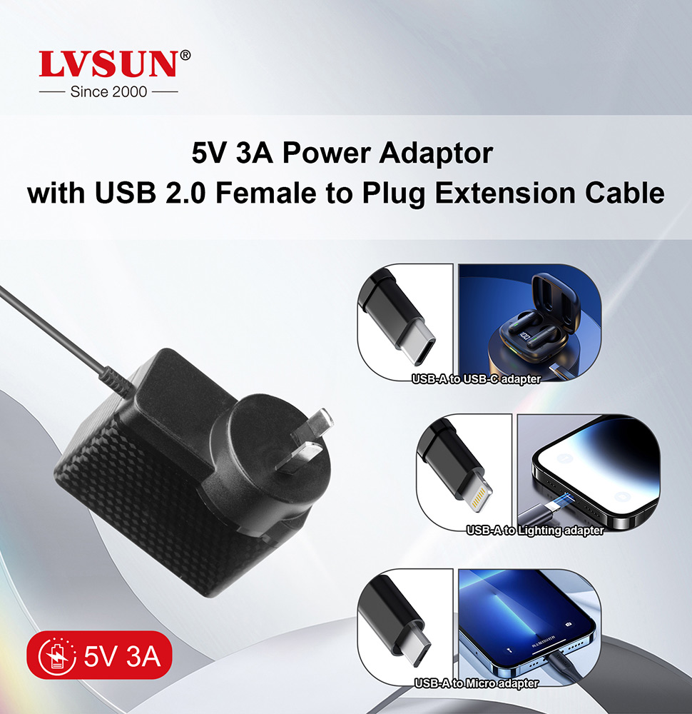 5V 3A Power Adaptor with USB 2.0 Female to Plug Extension Cable